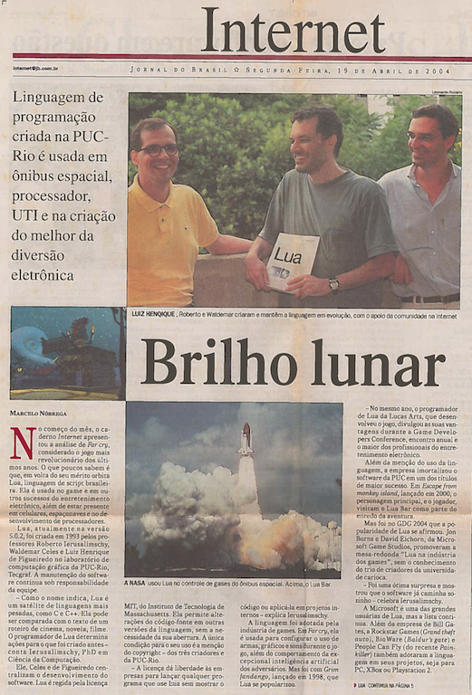 Durante três anos, entre as paredes do Departamento de Informática da PUC-Rio, os cariocas Roberto Ierusalimschy, Luiz Henrique de Figueiredo e Waldemar Celes criaram uma linguagem de programação que acabou se tornando o "xodó" dos desenvolvedores de games. A Lua, como foi batizada a linguagem, chamou inclusive a atenção da Lucas Arts, empresa especializada em produção de games, cujo dono é o premiado diretor de cinema George Lucas, que já produziu uma série de jogos, a partir da combinação da nova linguagem com a C++. O mais recente é o Grim Fandango.